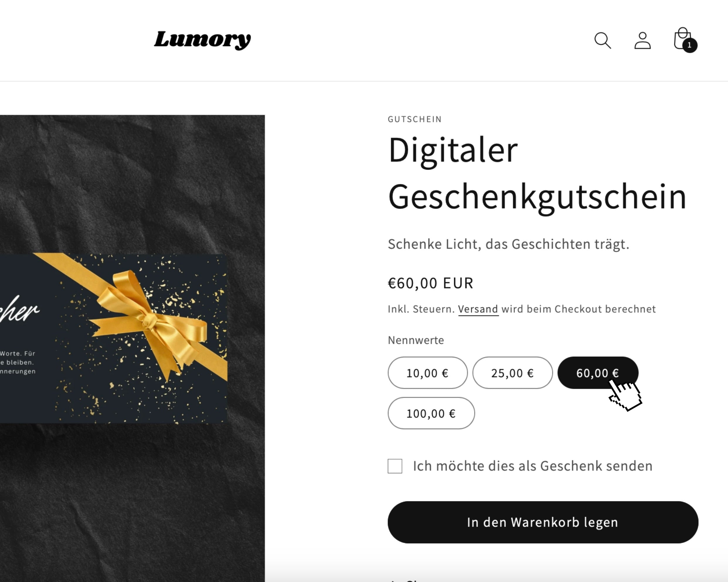 Wähle den passenden Betrag (10/25/70/100 €) und lege den Gutschein in den Warenkorb. Aktivierst du „Als Geschenk senden“, kannst du Empfängernamen, E-Mail und eine persönliche Nachricht hinzufügen – auf Wunsch mit geplantem Zustelldatum. Du kannst den Gutschein auch zusammen mit anderen Artikeln bestellen oder mehrere Gutscheine kombinieren.